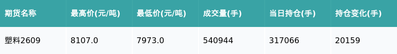 南财智讯4月16日电,盘后期货数据显示,大连商品交易所的塑料主力合约收涨0.46%,收盘报8091.0元/吨,日内资金流入1.97亿元。其他相关指标见下表: